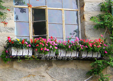 窗臺美化,考慮到要形成立體景觀及遮擋容器,植物要求以開花植物及藤本植物為主,用時令花草及藤本灌木,形成有層次的五彩繽紛的立體效果。